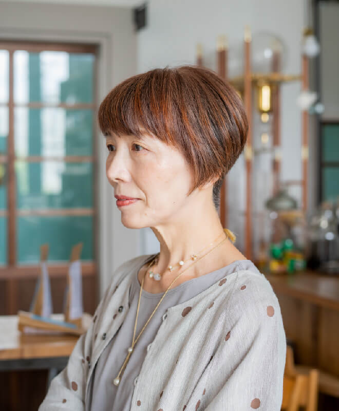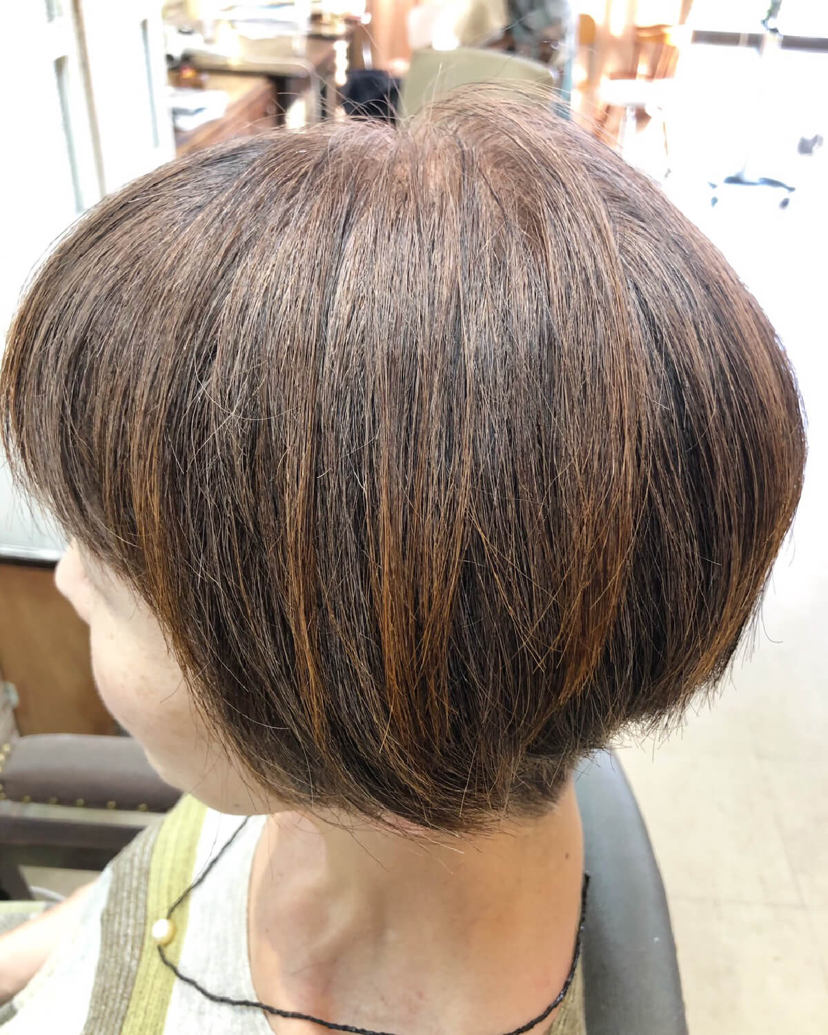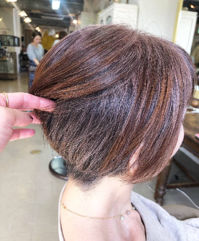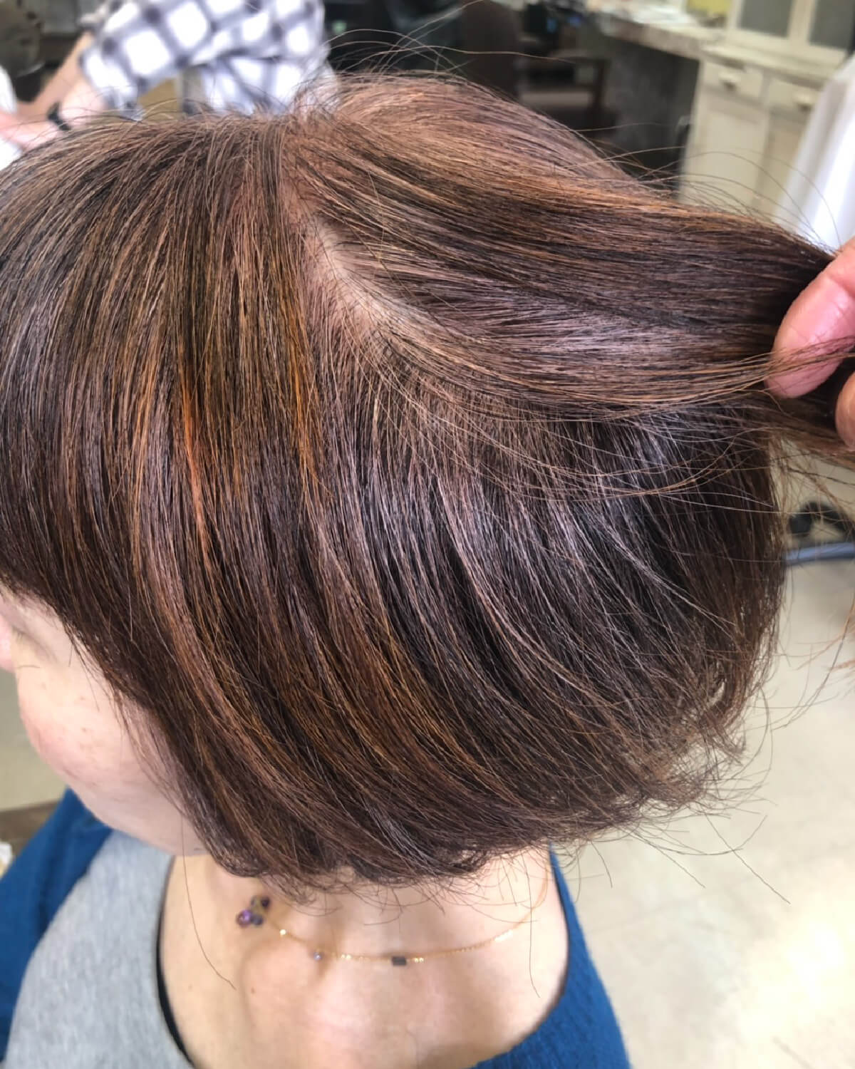 髪が伸びるのが速く、カラーをしても1週間すると白髪がちらほら。「また染めなくては」と思うのがストレスだったそう。そんなTさんへ提案したのは、髪の表面だけを明るく染め、内側の白髪と黒髪のコントラストを抑えてなじませていくという方法。」表面だけを染めるという施術も、提案されたカラーも、自分では決して思いつかないこと。最初はびっくりしましたが、高田さんの丁寧な説明とヘアスタイルを楽しみながら移行期を過ごせることに魅力を感じ、お願いしました」(Tさん)。