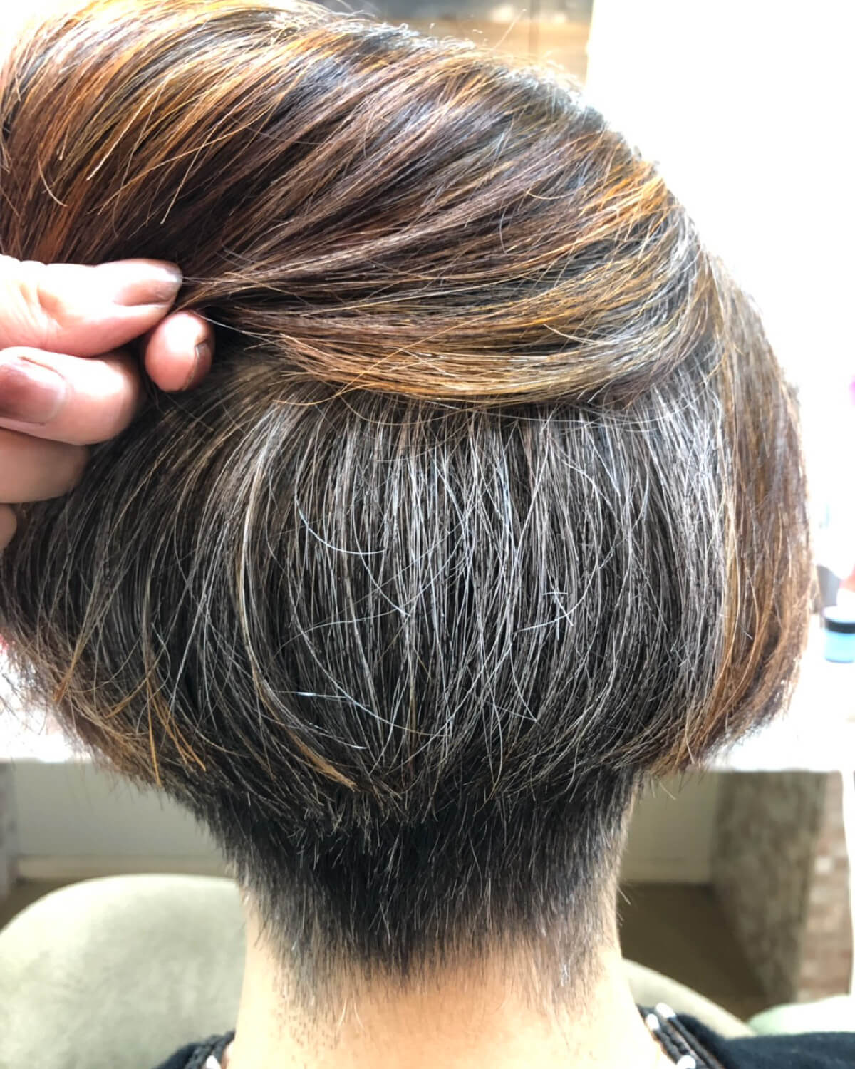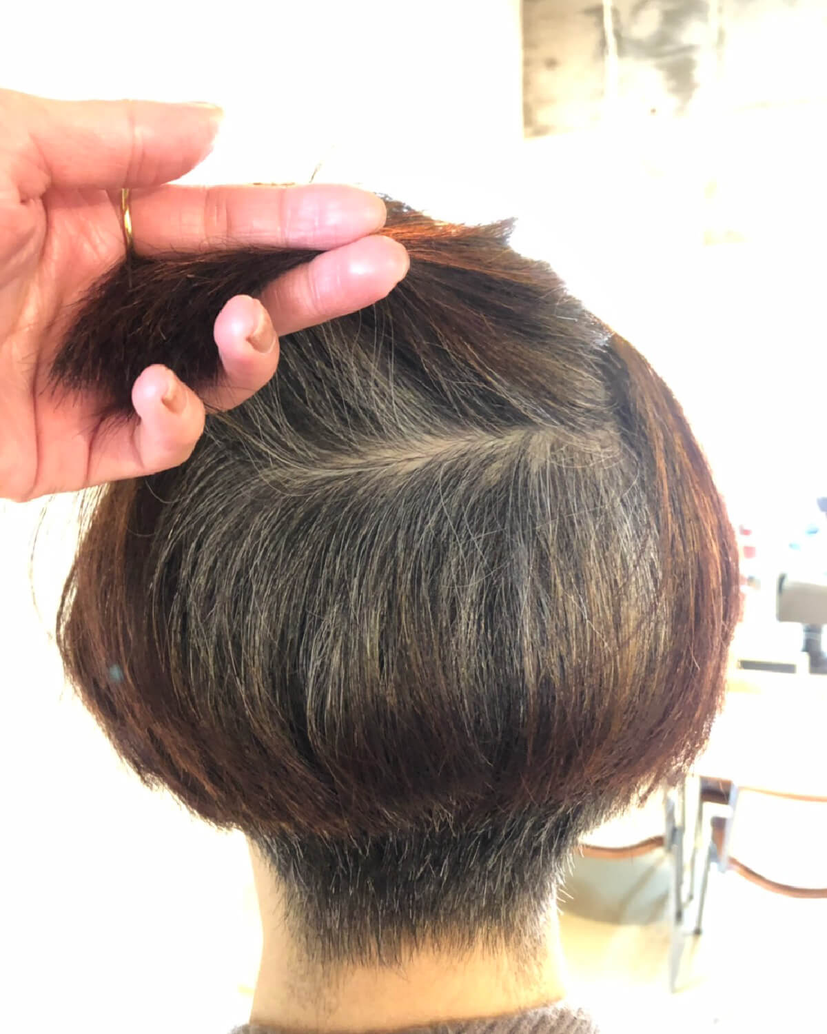 白髪が目立たないよう、染めているのは表面層だけ。内側は着々とグレイヘア化を進めている。